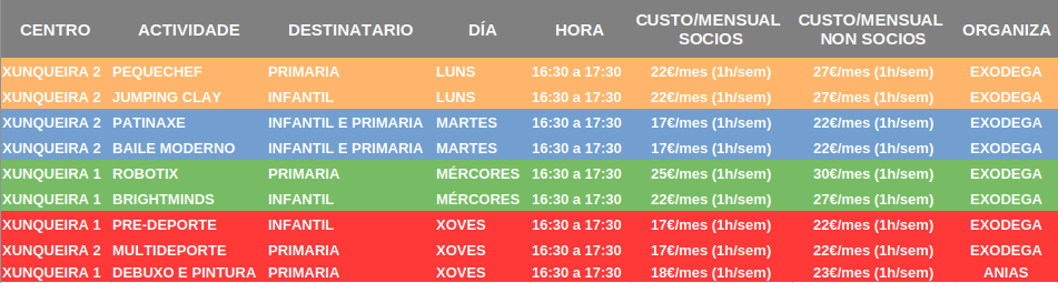 As actividades extraescolares comezarán a primeira semana de Outubro no horario previsto e rematarán en Xuño de 2026.